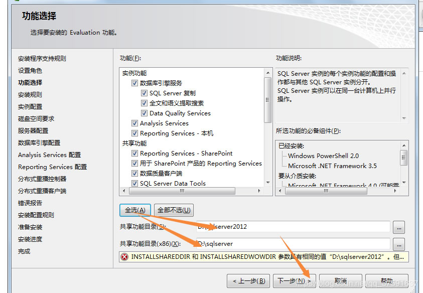 建議全選;由于SQL占用空間較大,本機修改了功能目錄存儲位置;