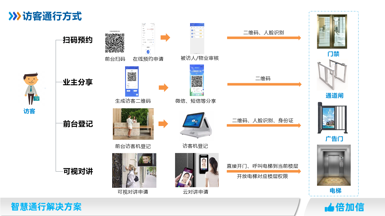 在住宅小區、寫字樓、園區、企事業單位等場所,物業往往針對外來人員都需要管控,我司提供多種訪客通行解決方案,滿足不同場景訪客進出物業管理需求。