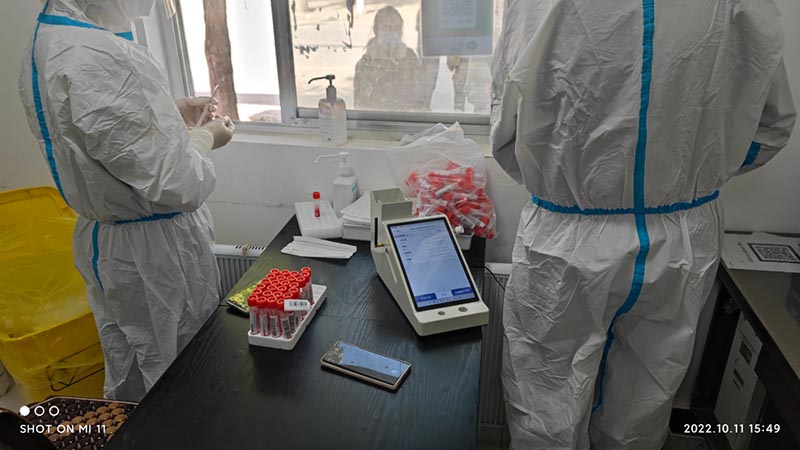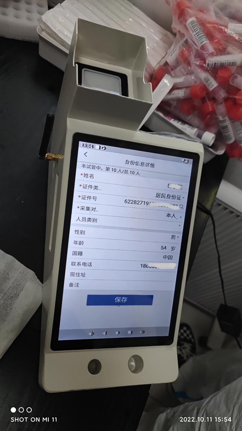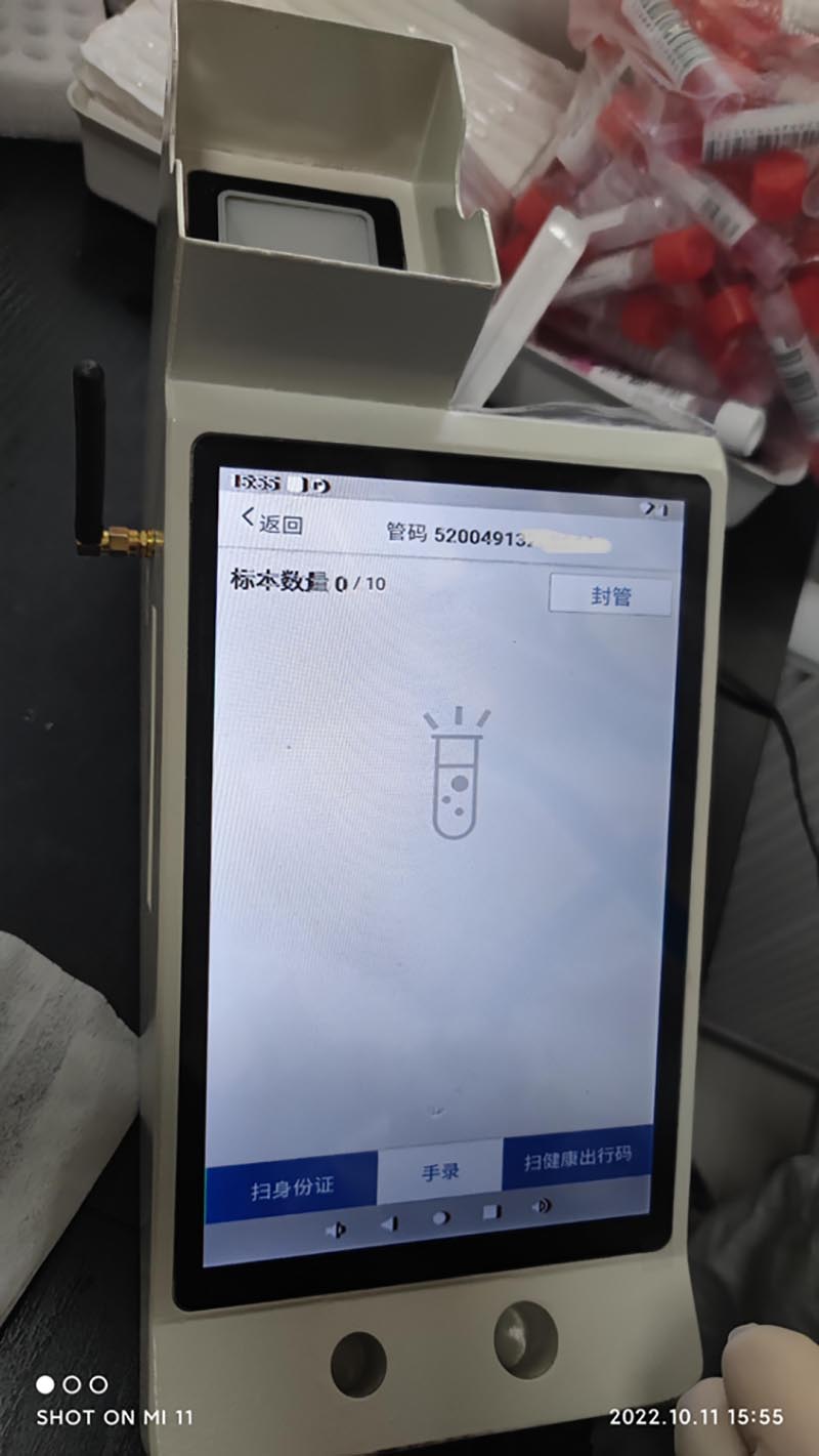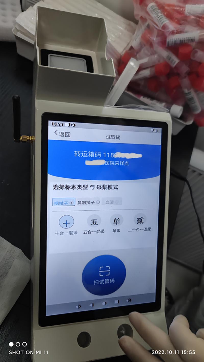核酸碼采集終端一體機(jī)一般放置在采樣操作的桌面上,也可以固定在采樣窗臺(tái)上。進(jìn)行采樣時(shí)醫(yī)療人員應(yīng)先根據(jù)采樣任務(wù)(單人單管、五人一管、十人一管、十五人一管或二十人一管)的要求在核酸碼采集終端一體機(jī)上進(jìn)行相對(duì)應(yīng)的選擇,然后對(duì)試管條碼進(jìn)行掃描;接著受檢人員上前向核酸碼采集終端一體機(jī)出示核酸采樣碼或身份證,核酸碼采集終端一體機(jī)可在一秒內(nèi)完成信息的讀取與上傳;最后由醫(yī)療人員為受檢人員進(jìn)行鼻拭子或咽拭子,在完成既定人數(shù)采樣后,核酸碼采集終端一體機(jī)會(huì)自動(dòng)結(jié)束這管試劑的數(shù)據(jù)錄入并實(shí)時(shí)上傳平臺(tái)系統(tǒng)。此時(shí),醫(yī)療采樣人員只需要拿出新的試管掃碼即可開啟新管進(jìn)行下一輪采樣。